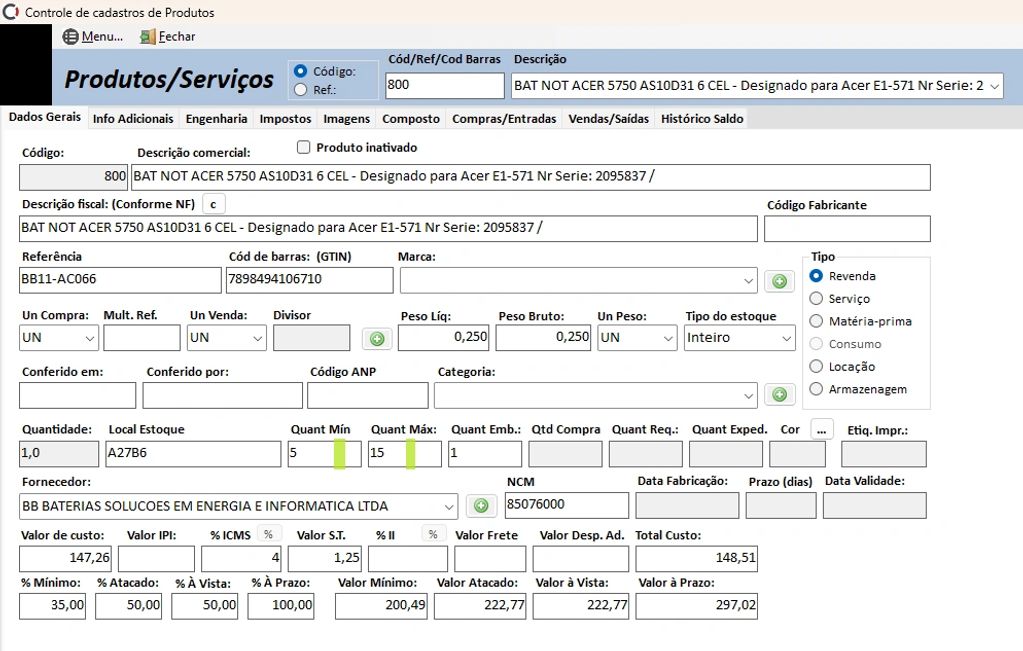 Atraves dos valores de estoque mínimo e máximo, crie parâmetros de compras e não deixe que falte nada em seu estoque.